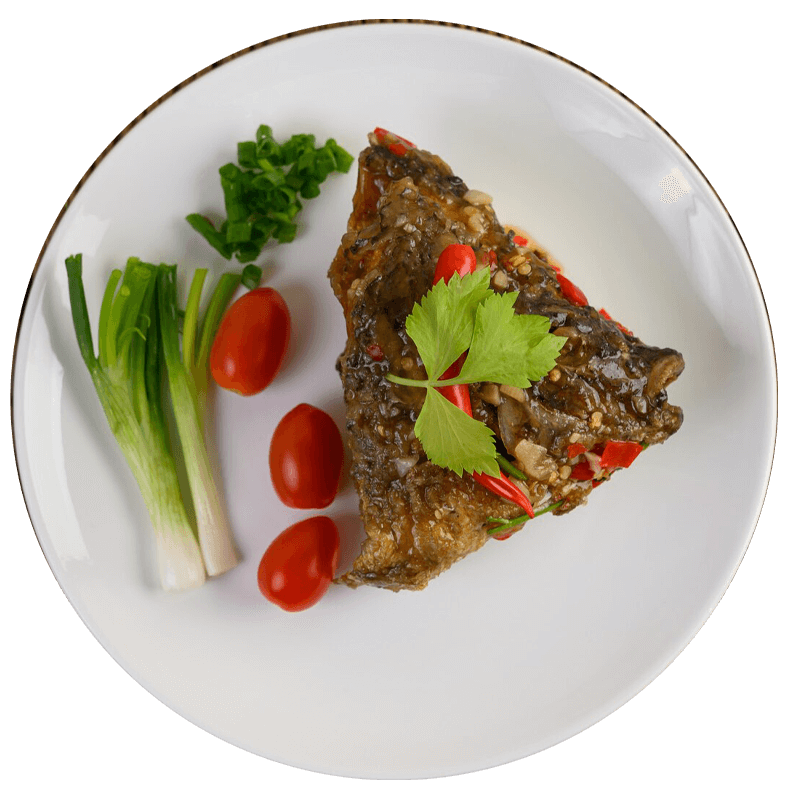 Deep fried head fish with tomatoes